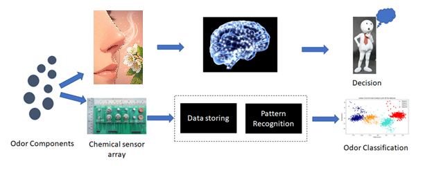 The above figure illustrates the possibility of imitating the brain’s capability to distinguish between different odours using electronic means i.e., an electronic nose. To characterize this special sensory phenomenon using an electronic nose, the following factors need to be addressed: